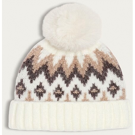 Knitted Fair Isle Pattern Pom Pom Beanie Hat in Neutral