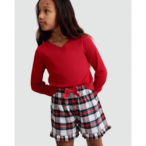 Girls Lace Trim Top and Check Print Shorts Pyjamas in Red Multi