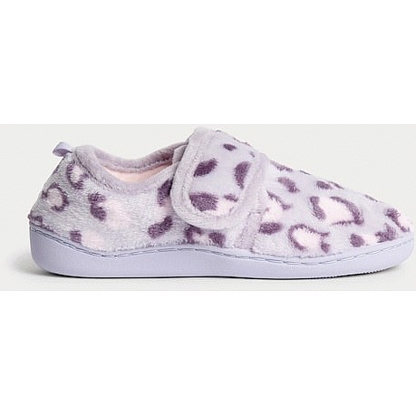 Girls Fluffy Leopard Print Strap Fastening Slippers in Lilac