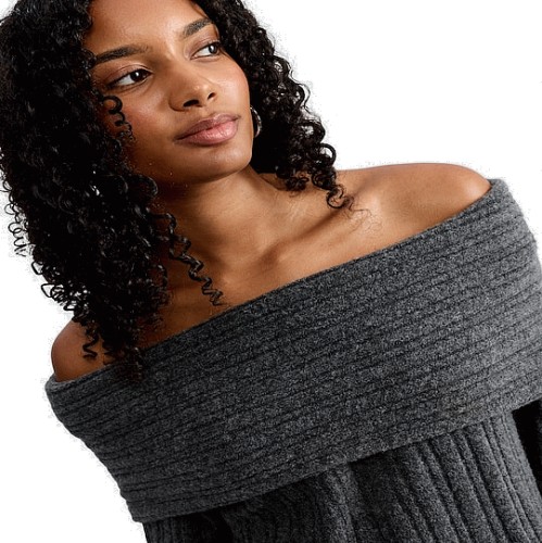 Ribbed Knitted Off Shoulder Dress with Wool in Grey