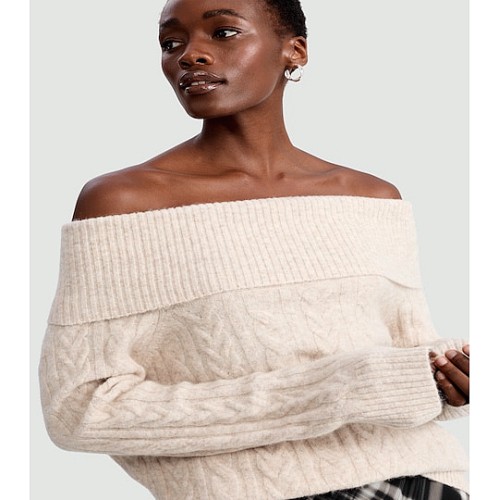 Cable Knit Off Shoulder Jumper with Wool in Neutral