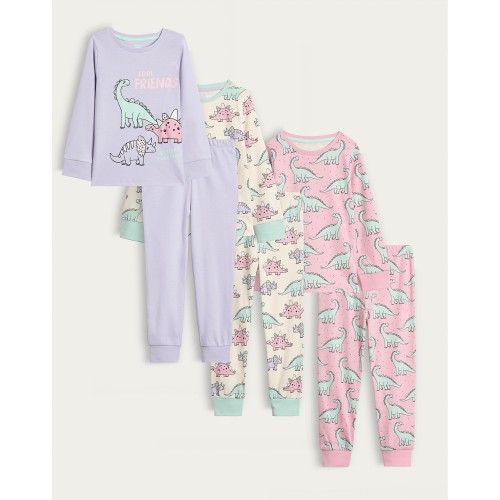 Girls 3-Pack Pure Cotton Dinosaur Pyjamas in Lilac Multi