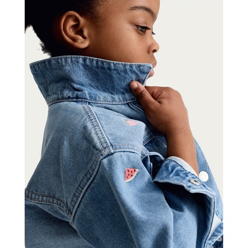 F&F Girls Pure Cotton Fruit Embroidered Button Up Denim Jacket in Blue