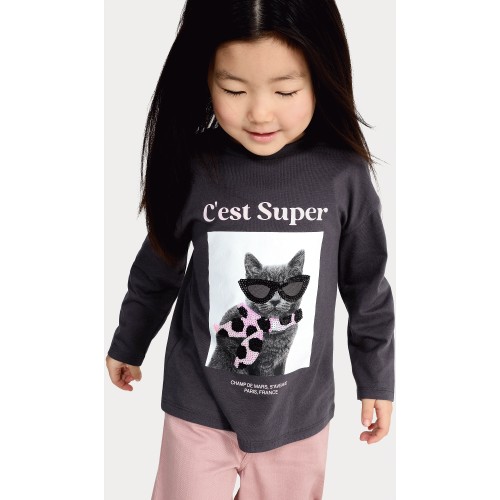 F&F Girls Pure Cotton Cat Print Long Sleeved Top in Black