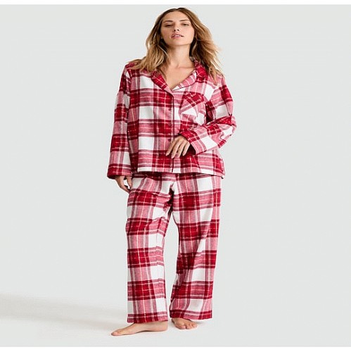 Cotton Rich Check Print Revere Shirt and Trousers Pyjama Set in Red