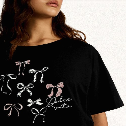 Pure Cotton Bow Print Short Sleeved Pyjama Top in Black