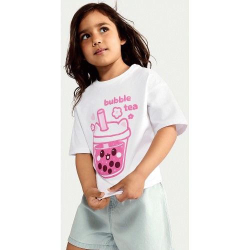 F&F Girls Pure Cotton Bubble Tea Print T-Shirt in White