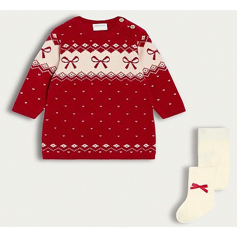 2-Piece Knitted Bow Pattern Dress and Tights Set in Red