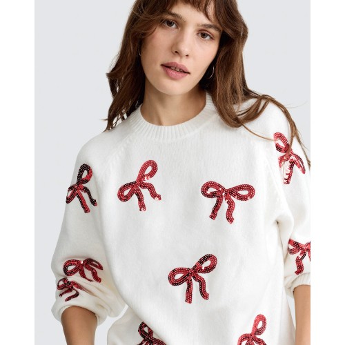 Knitted Sequin Bow High Neck Jumper with Wool in Grey