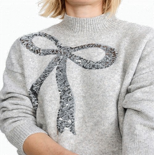 Knitted Sequin Bow High Neck Jumper with Wool in Grey