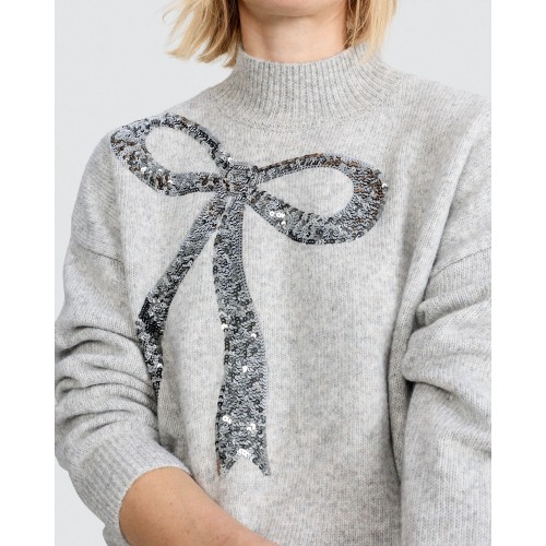 Knitted Sequin Bow High Neck Jumper with Wool in Grey