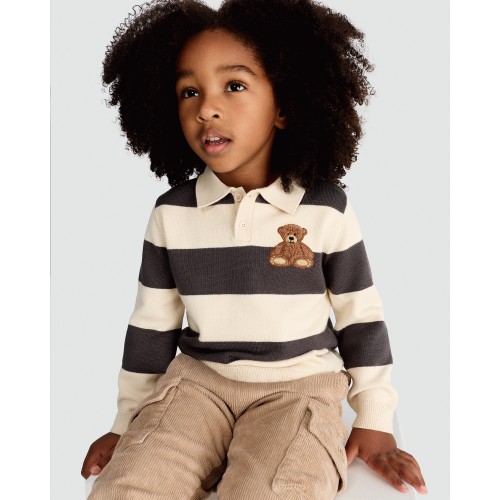 F&F Boys Stripe Print Teddy Bear Rugby Jumper in Grey