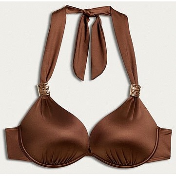 High Shine Metal Accent Halter Neck Wired Bikini Top in Brown