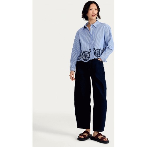 Pure Cotton Poplin Stripe Embroidered Scallop Hem Shirt in Multi Blue