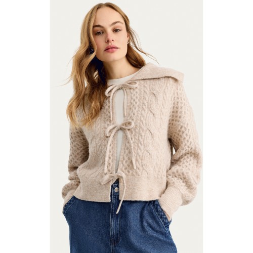 Cable Knit Tie Front Cardigan with Wool in Mink