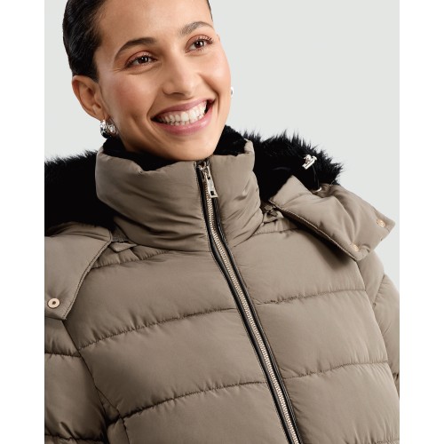 Faux Fur Trim Hooded Shower Resistant Puffer Coat in Khaki