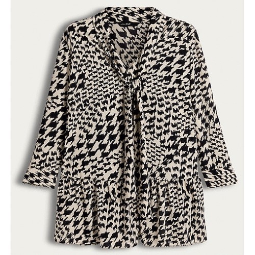 Satin Houndstooth Print Tie Neck Dress in Multi Black White