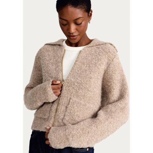 Boucle Textured Zip Up Cardigan with Wool in Mink