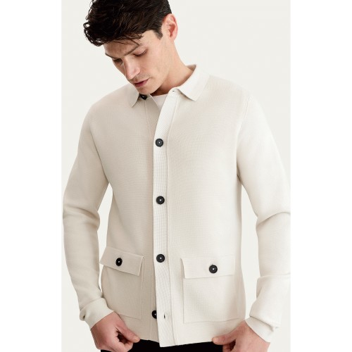 Knitted Patch Pocket Relaxed Fit Button Up Cardigan in Ecru