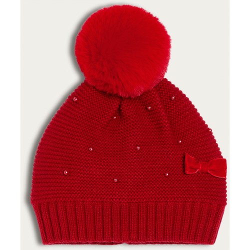Girls Knitted Bow Faux Pearl Pom Pom Beanie Hat in Red