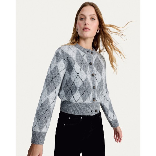 Knitted Argyle Print Button Up Cardigan in Multi Grey