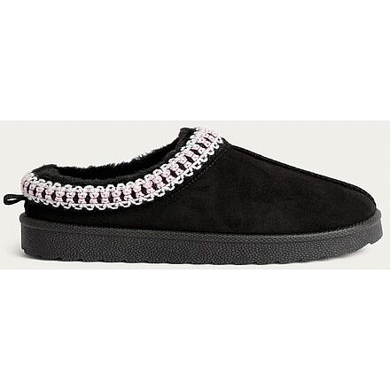 Girls Woven Trim Faux Fur Lined Chunky Slippers in Black