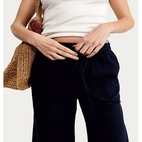 Linen Rich Wide Leg Cropped Drawstring Trousers in Navy
