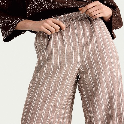 Linen Rich Striped Wide Leg Drawstring Trousers in Brown