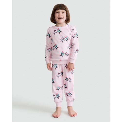 Girls Minky Fleece Penguin Print Pyjama Set in Pink