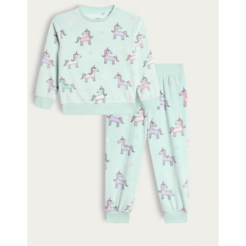 Girls Minky Fleece Unicorn Print Pyjama Set in Green Multi