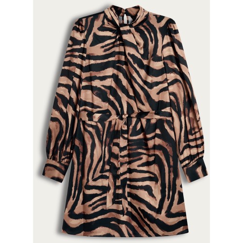 Satin Zebra Print Tie Neck Long Sleeved Dress in Multi Brown