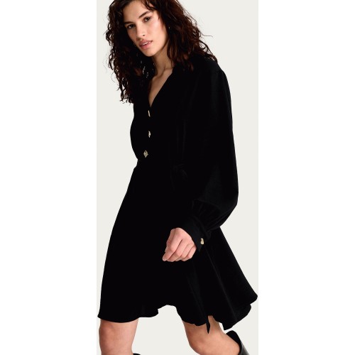 Gold Button Belted Long Sleeved Mini Dress in Black
