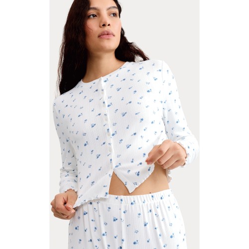 Pointelle Floral Print Button Up Pyjama Top in Cream