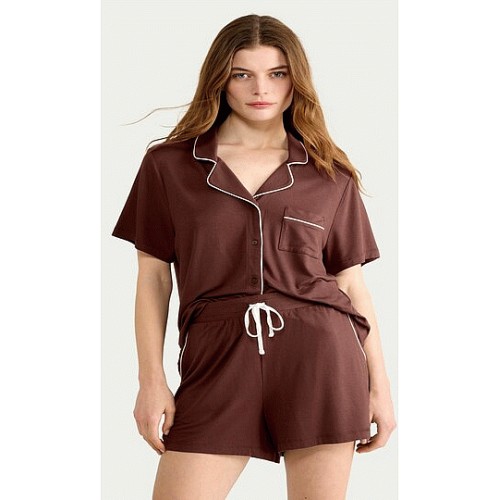 Contrast Piping Revere Short Pyjama Set in Chocolate