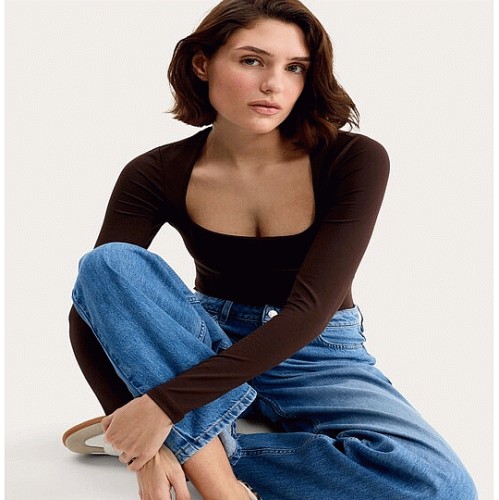 Polyamide Square Neck Long Sleeved Bodysuit in Chocolate