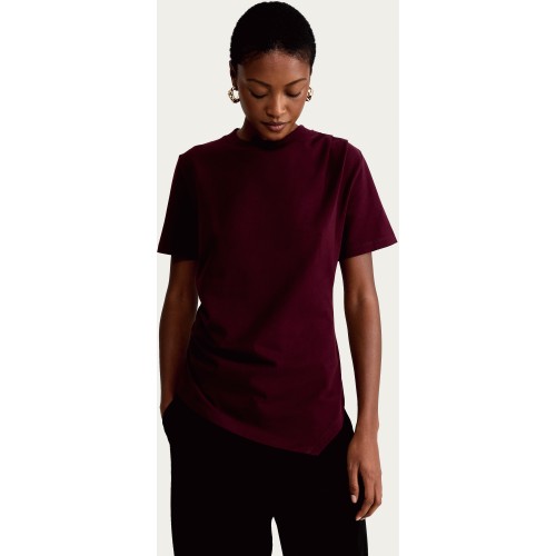 Pure Cotton Asymmetric Hem Ruched Short Sleeved Top in Burgundy