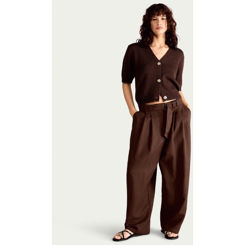 Lyocell Rich Pleated Barrel Leg Belted Trousers in Brown
