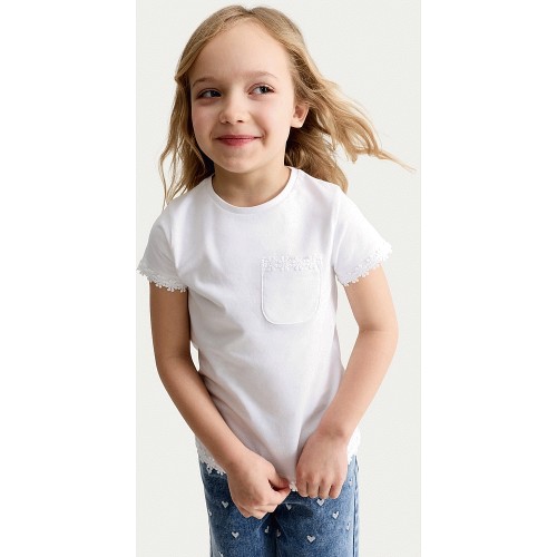 F&F Girls Pure Cotton Floral Trim T-Shirt in White