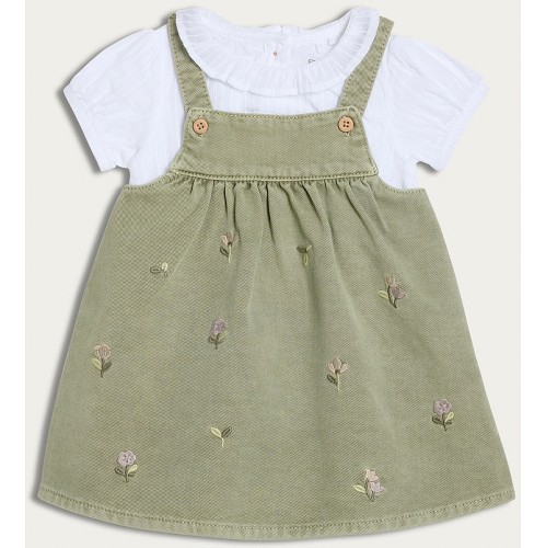 2-Piece Pure Cotton Denim Embroidered Pinafore Dress and Bodysuit Set in Green