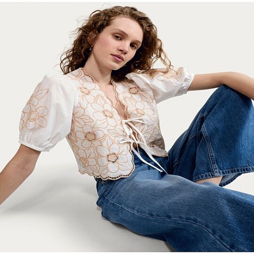Pure Cotton Floral Embroidered Tie Front Blouse in Multi White