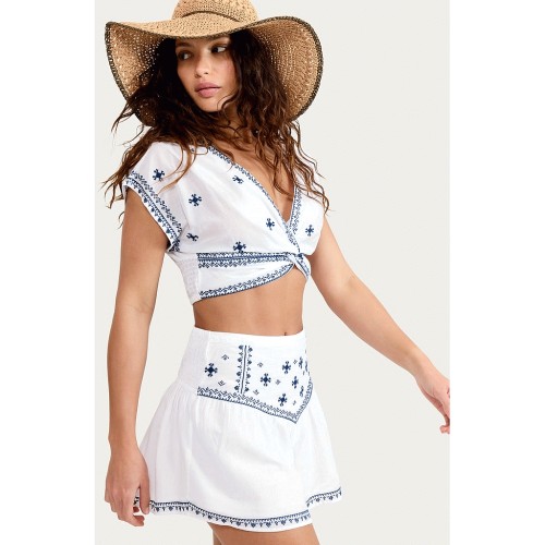 Pure Cotton Embroidered Knot Front Co-ord Beach Blouse in Multi Blue