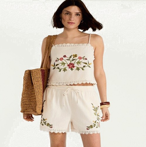 Cotton Rich Floral Embroidered Co-ord Shorts in Cream