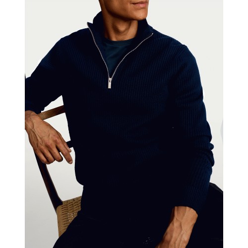 Pure Cotton Ribbed Half Zip Jumper in Navy
