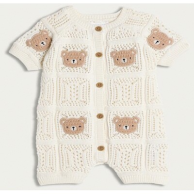 Pure Cotton Knitted Bear Pattern Short Sleeved Romper in White