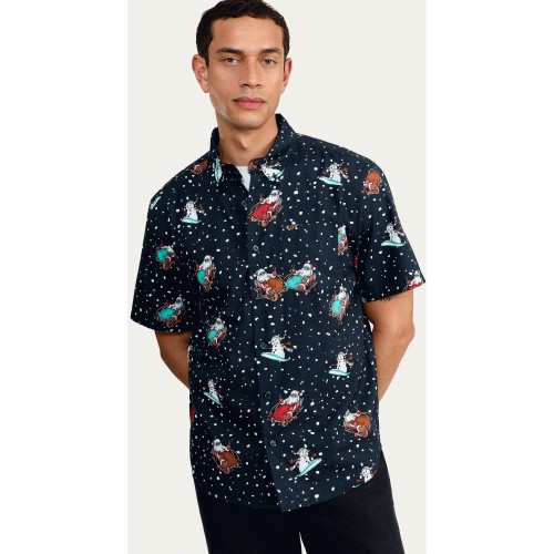 Pure Cotton Snowman and Sleigh Print Shirt in Navy