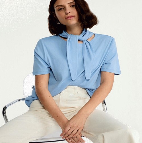 Pure Cotton Scarf Neck Short Sleeved Top in Blue