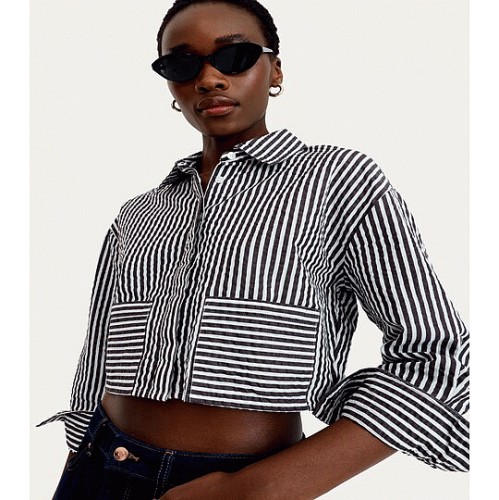 Pure Cotton Seersucker Striped Cropped Shirt in Brown