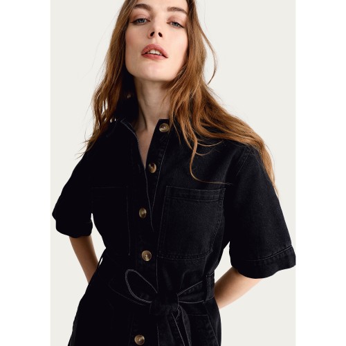 Pure Cotton Button Front Short Sleeved Denim Shirt Dress in Black