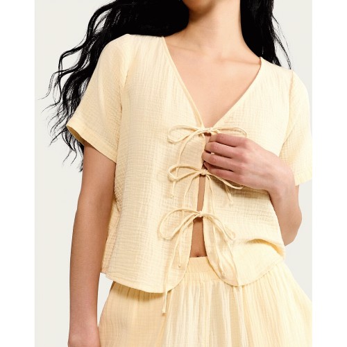 Pure Cotton Double Cloth Tie Front Pyjama Set in Yellow