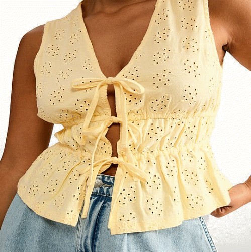 Pure Cotton Sleeveless Broderie Tie Front Top in Yellow
